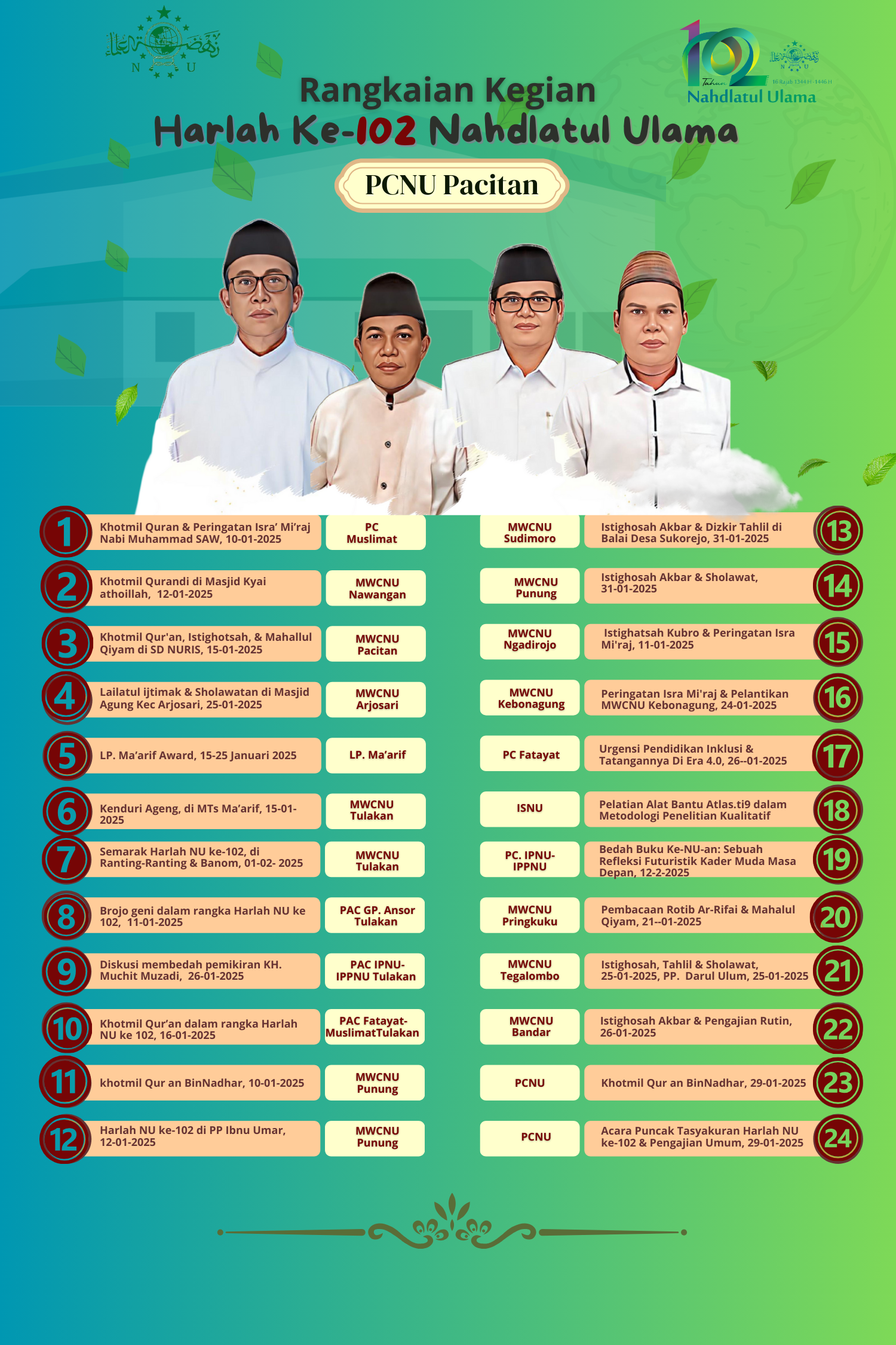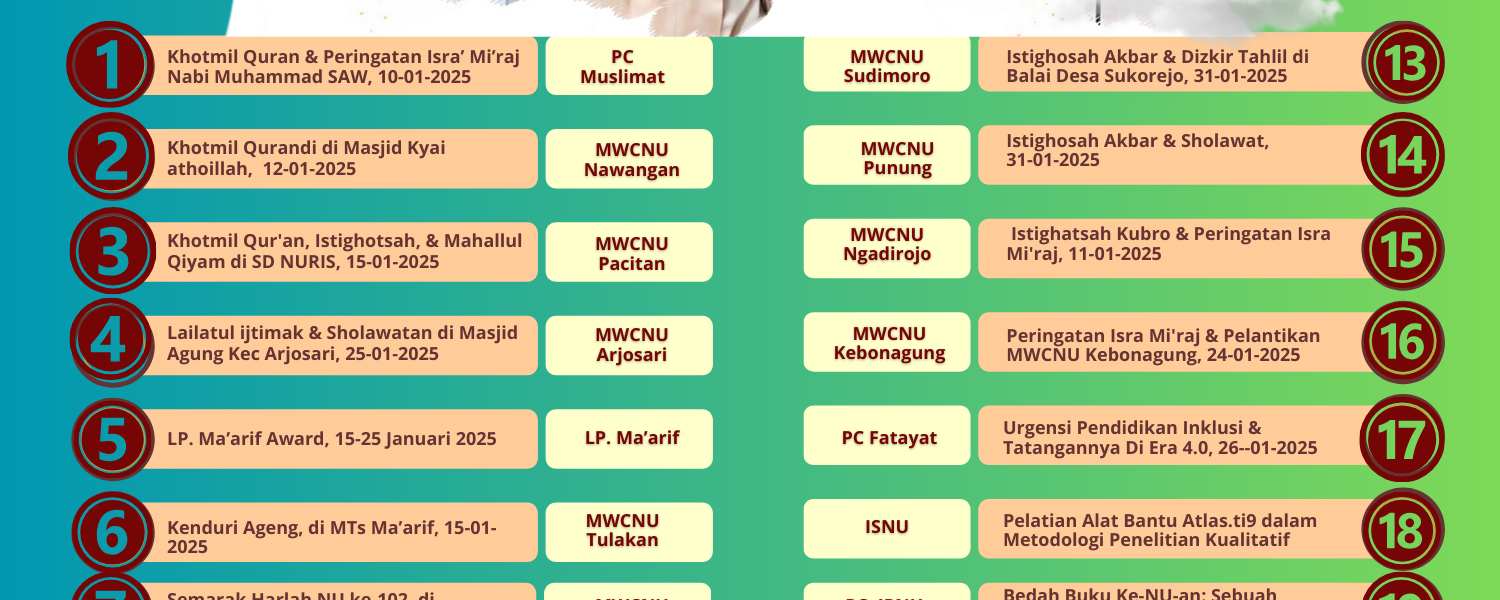 HomepageGaleri & PublikasiRangkaian Agenda Harlah NU ke-102 PCNU Pacitan Galeri & Publikasi Rangkaian Agenda Harlah NU ke-102 PCNU Pacitan Posted on January 11, 2025 Kick off Rangkaian Harlah NU ke-102 PCNU Kab. Pacitan, semoga Allah SWT memberikan kemudahan dan ridhaNya, amin. LEAVE A RESPONSE Cancel replyYour email address will not be published. Required fields are marked *Comment * Name * Email * Website Save my name, email, and website in this browser for the next time I comment. Post navigation Previous PostRevitalisasi Islam Nusantara Di Era Digital Next PostPCNU Pacitan Gelar Tasyakuran HARLAH NU ke-102 You Might Also Like Galeri & Publikasi Selamat Tahun Baru 2025 M & 1 Rajab 1446 H pcnu January 1, 2025 Galeri & Publikasi Pelantikan PCNU Kab. Pacitan pcnu December 27, 2024 Galeri & Publikasi Marhaban Yaa Ramadhan, Marhaban Yaa Shahrus Syiam pcnu February 28, 2025 Galeri & Publikasi Rapat Harian PCNU Kab. Pacitan pcnu December 27, 2024