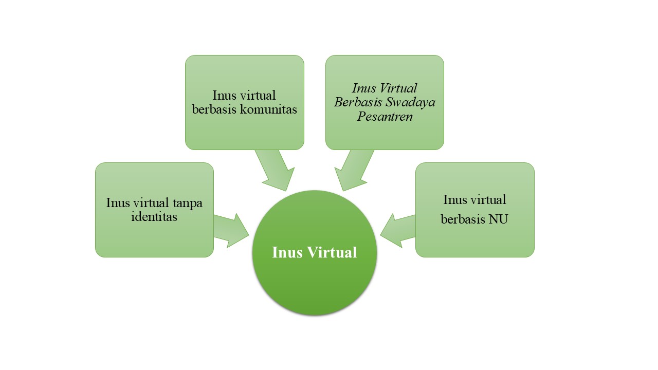 Secara konseptual, eksisistensi Inus versi virtual (dunia maya) dapat direkayasa melalui empat model, yakni; (1) Inus virtual tanpa identitas, (2) Inus virtual berbasis swadaya pesantren, (3) Inus virtual berbasis komunitas Inus, dan (4) Inus virtual berbasis Nadlatul Ulama. Konstruksi bangunan Inus virtual dapat mengikuti pola pesantren virtual yang sudah berkembang selama ini. Lebih detail dapat dilihat pada gambar 2 berikut ini: